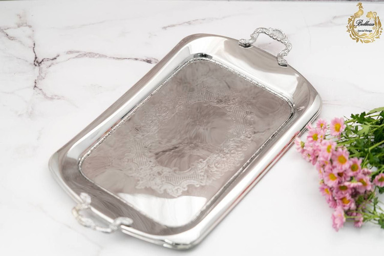 سینی مستطیل دسته دار فرشته استیل برنج تمام سیلور کد1099