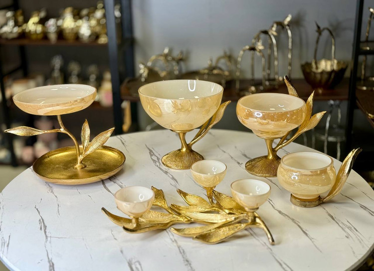 سرویس 5 تیکه پذیرایی بلور مات رنگی و طلایی مدل برگ کد0038