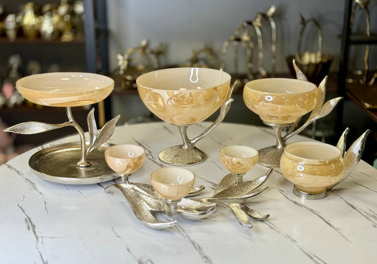 سرویس 5 تیکه پذیرایی بلور مات رنگی و سیلور مدل برگ کد0039