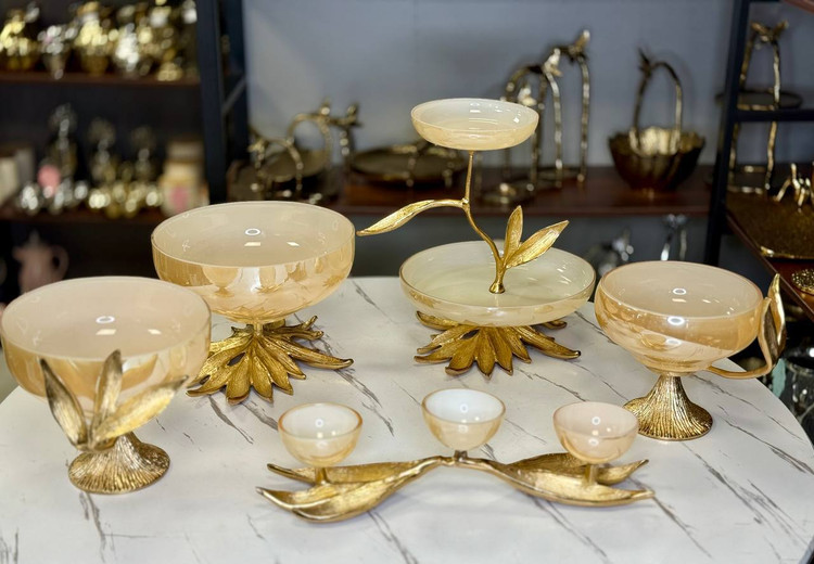 سرویس 5 تیکه پذیرایی بلور مات رنگی و طلایی مدل برگ کد0046